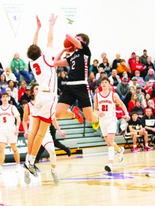 Jackson Ruggles goes high to get a shot off against Coon Rapids-Bayard during the Raider’s season ending loss last week. PHOTO BY JILL EHLEN.